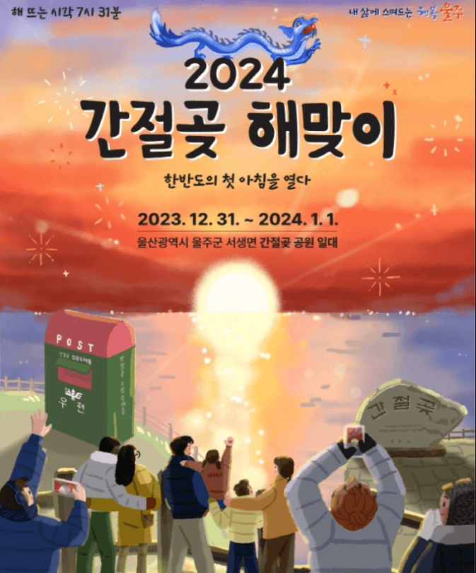 대한민국에서 가장 먼저 해가 뜨는 곳으로 간절곶이 있습니다. 2024년 새해를 맞이하여 해맞이 축제가 열리는데요. 간절곶 해맞이 축제는 12월 31일부터 1월 1일까지 간절곶 공원 일대에서 개최됩니다.