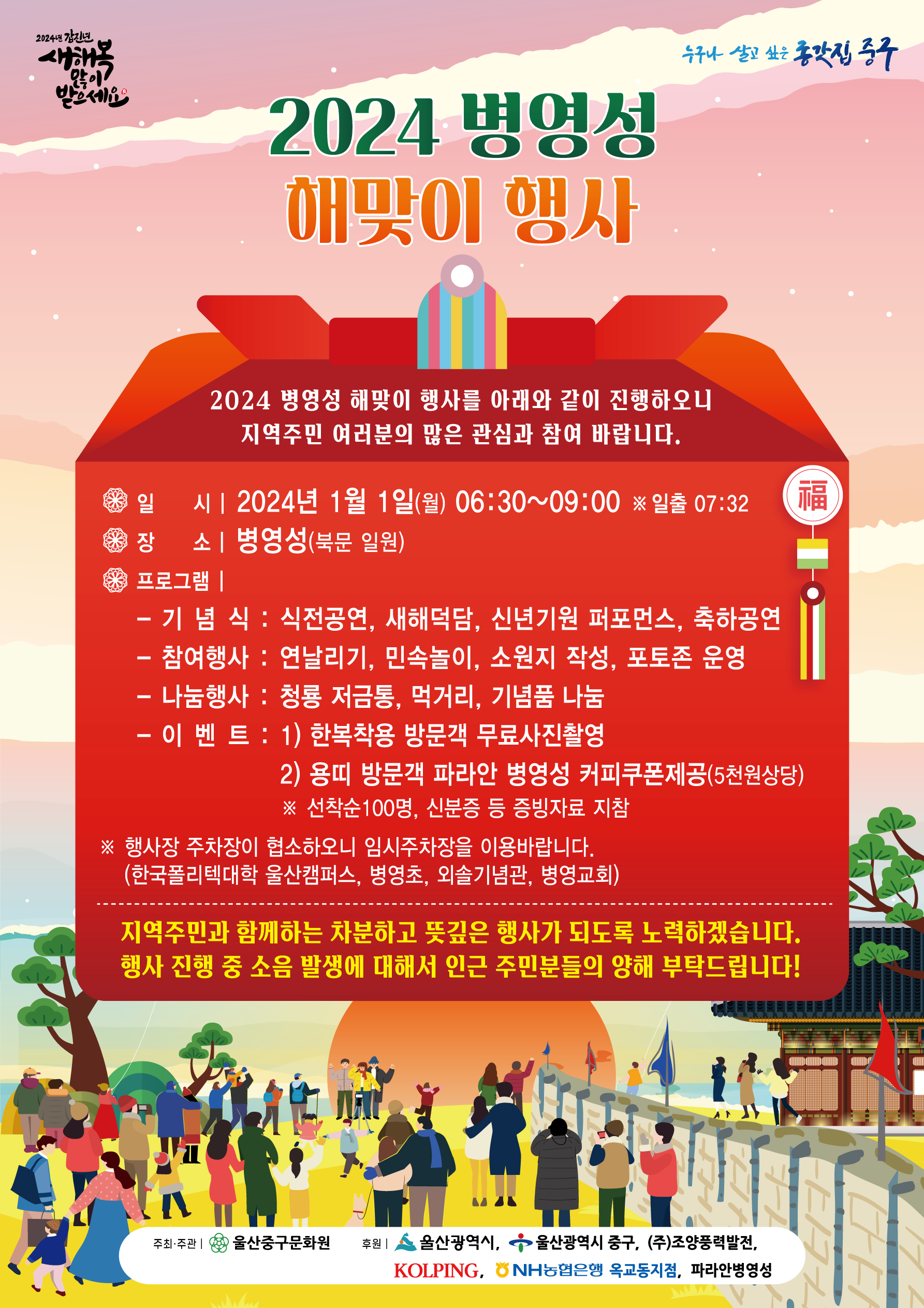 2024년 갑진년을 맞이하여 울산 중구 병영성에서 해맞이 축제를 합니다. 울산 중구에 사시는 분들은 가까운 병영성에서 새해맞이를 하셔도 좋을 듯합니다.